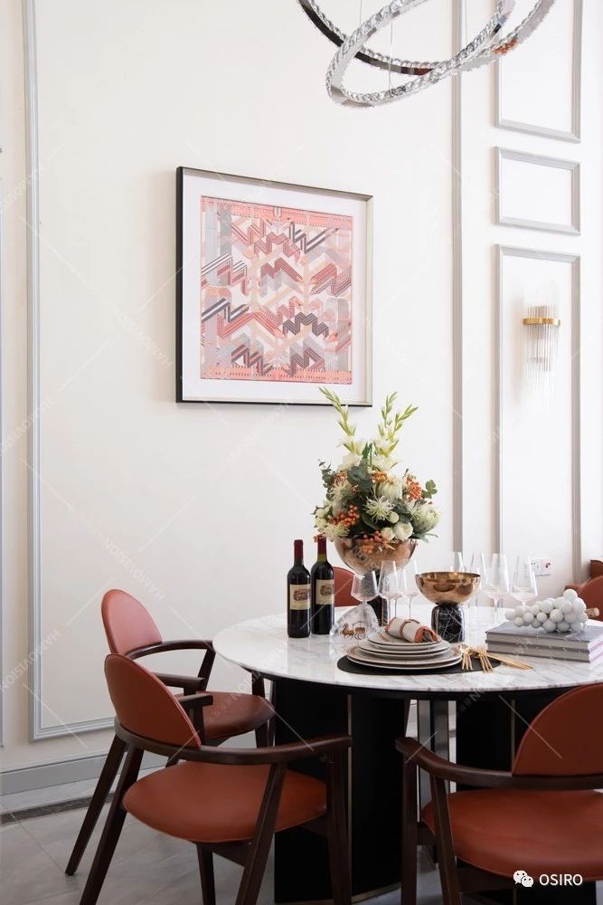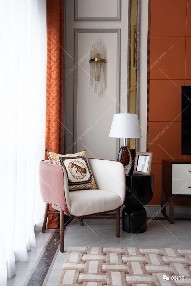青岛潍坊空间设计以橙色为主色调开启了“摩登”艺术之旅,由HERMES丝巾装裱而成艺术挂画流畅大气, 一抹橙色激活墙面的生活气息,别致的家具也处处透着主人的身份与生活品质。“大礼不辞小让”,